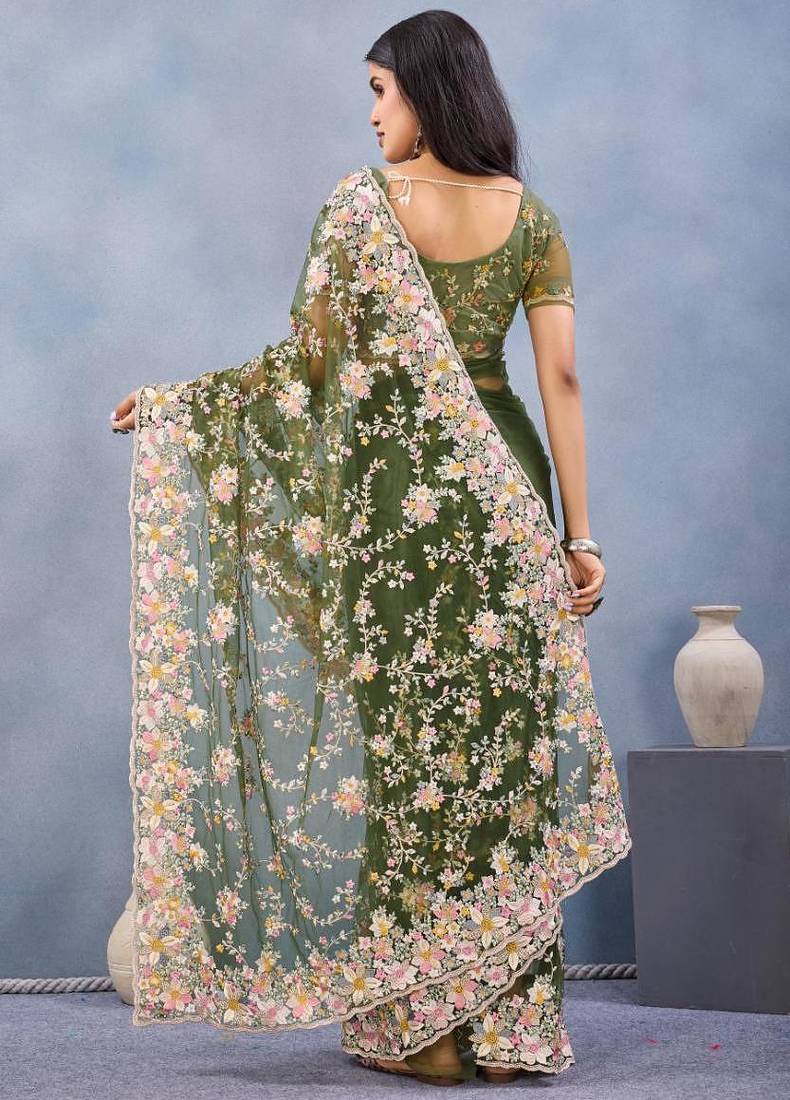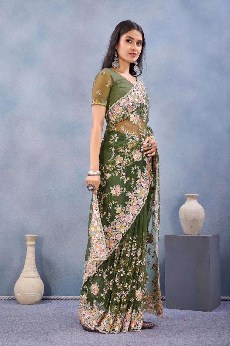 | Product Name | Mehendi Green Color Net Resham Embroidered & Handwork Zircon Work Saree | |
