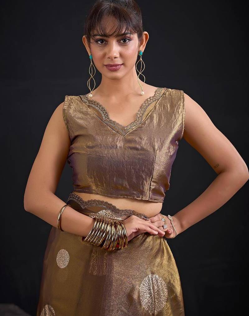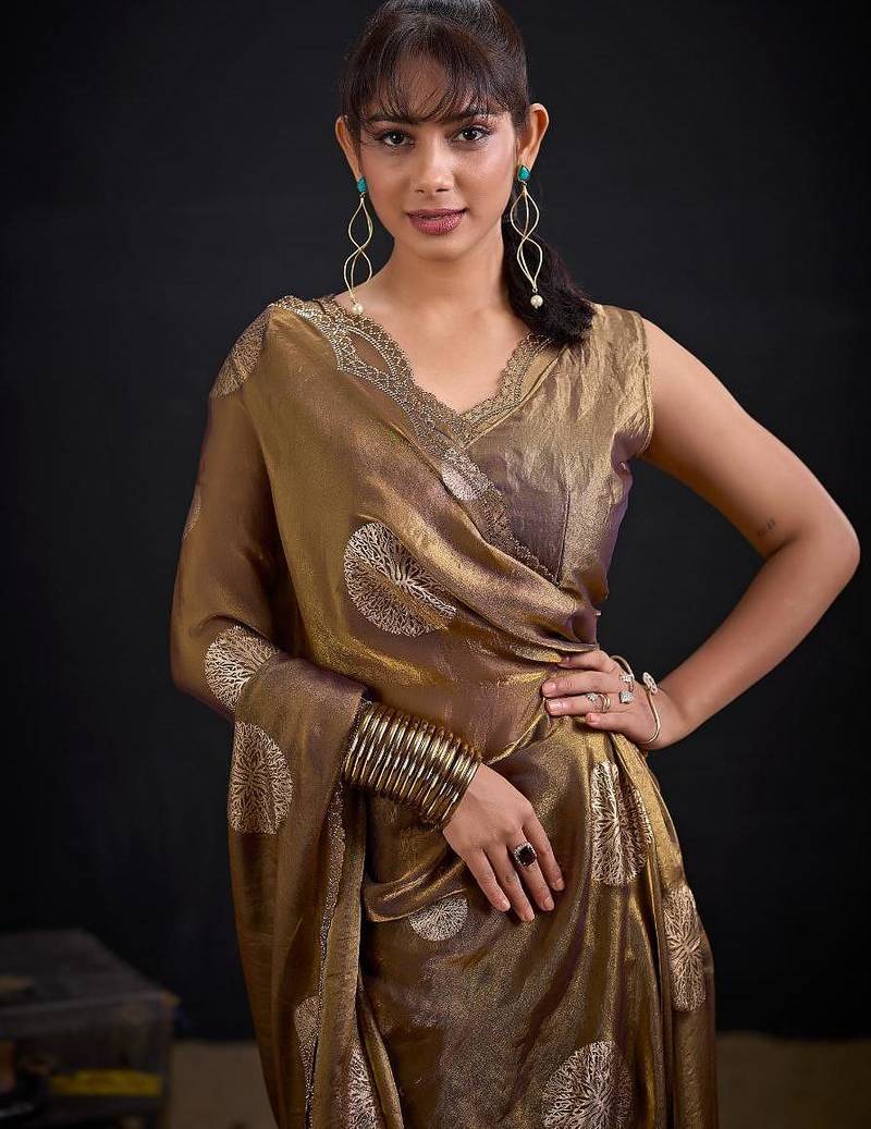 Mouse color fendi silk two ton with foil handwork zircon work saree