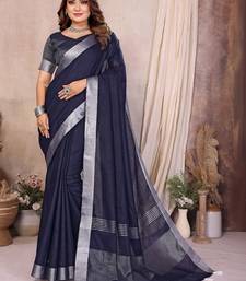 Navy blue color linen cotton silver zari border saree with un-stitched blouse