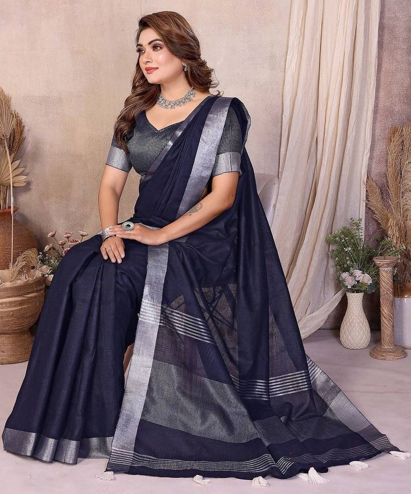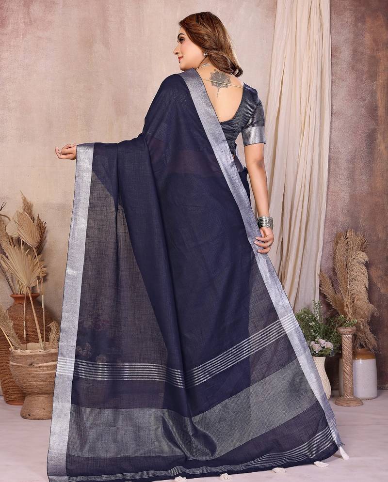| Product Name | Navy Blue Color Linen Cotton Silver Zari Border Saree With Un Stitched Blouse | |
