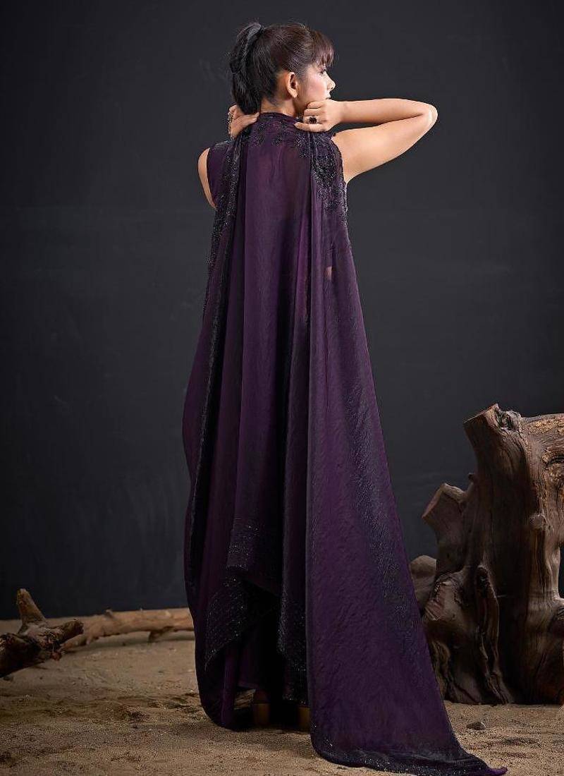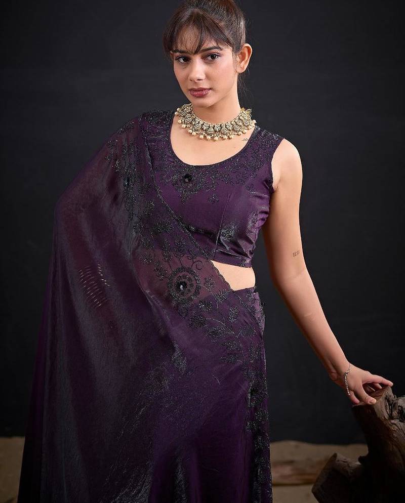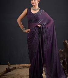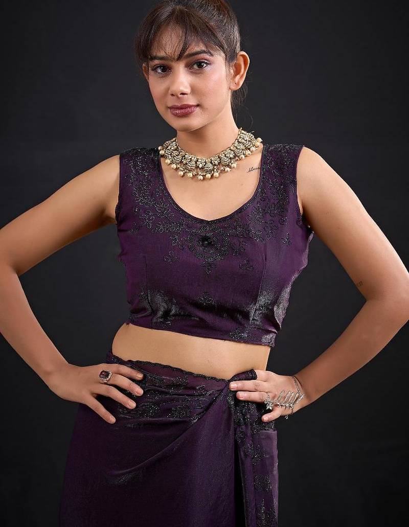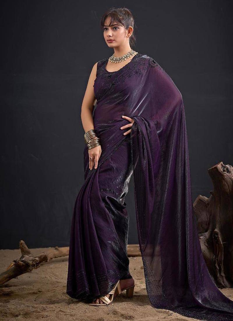 Purple color fendy satin silk two tone zircon sequence handwork saree