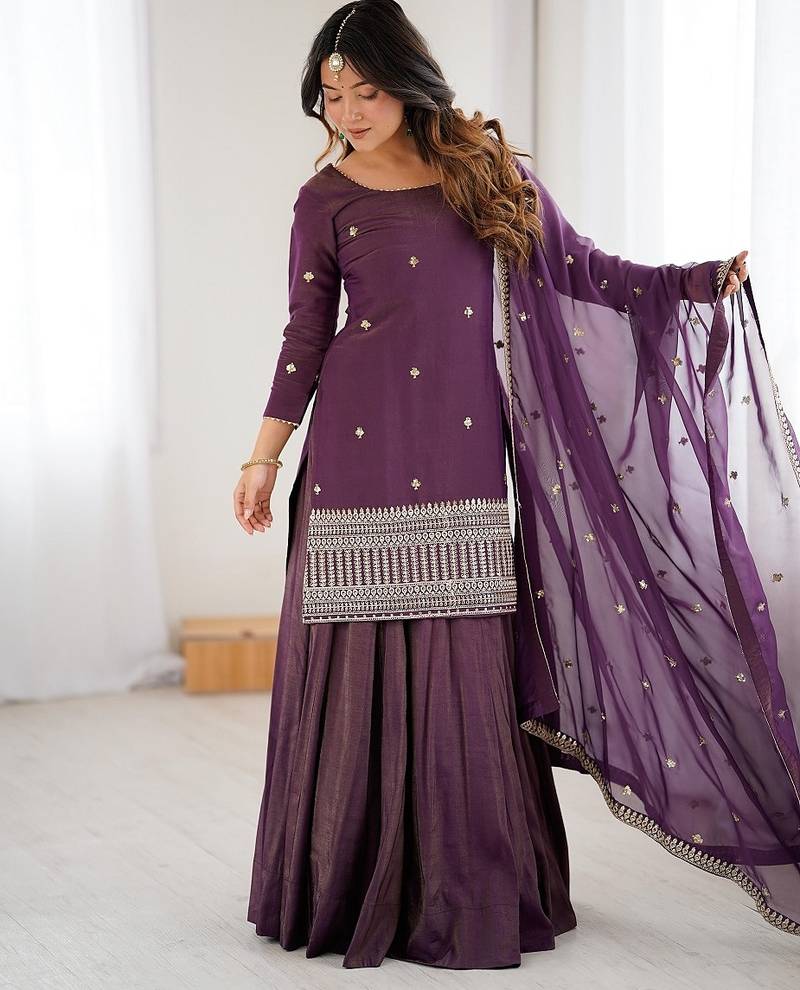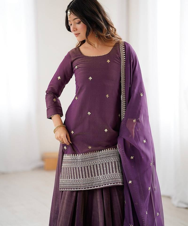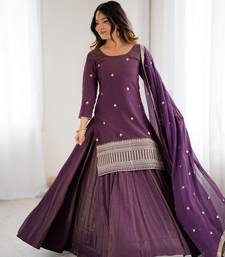 Purple color zari sequince embroidered work roman shimmer chanderi silk anarkali set stitched