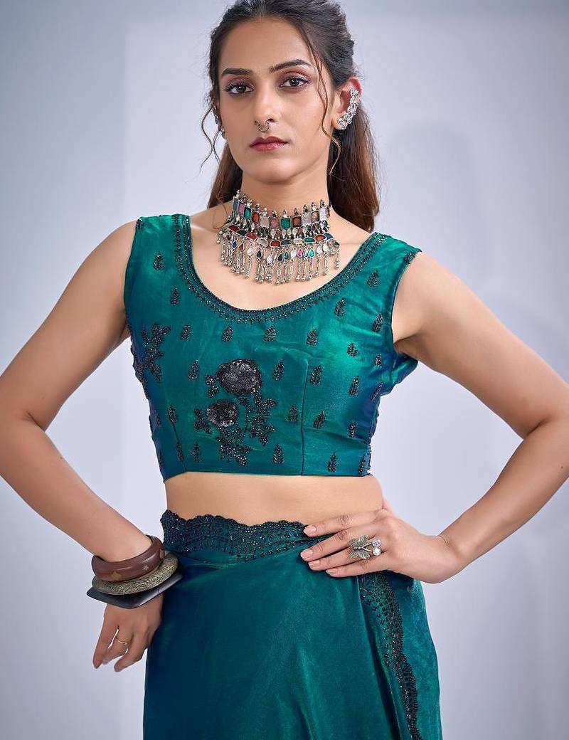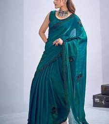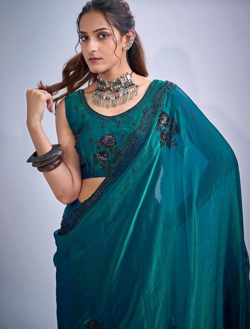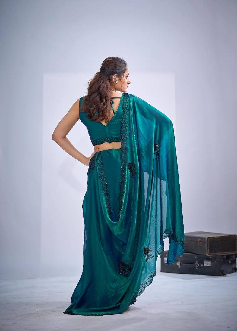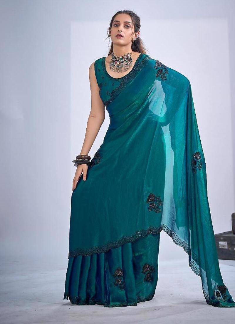Rama color fendy satin silk two tone zircon cut dana & sequence hand work saree