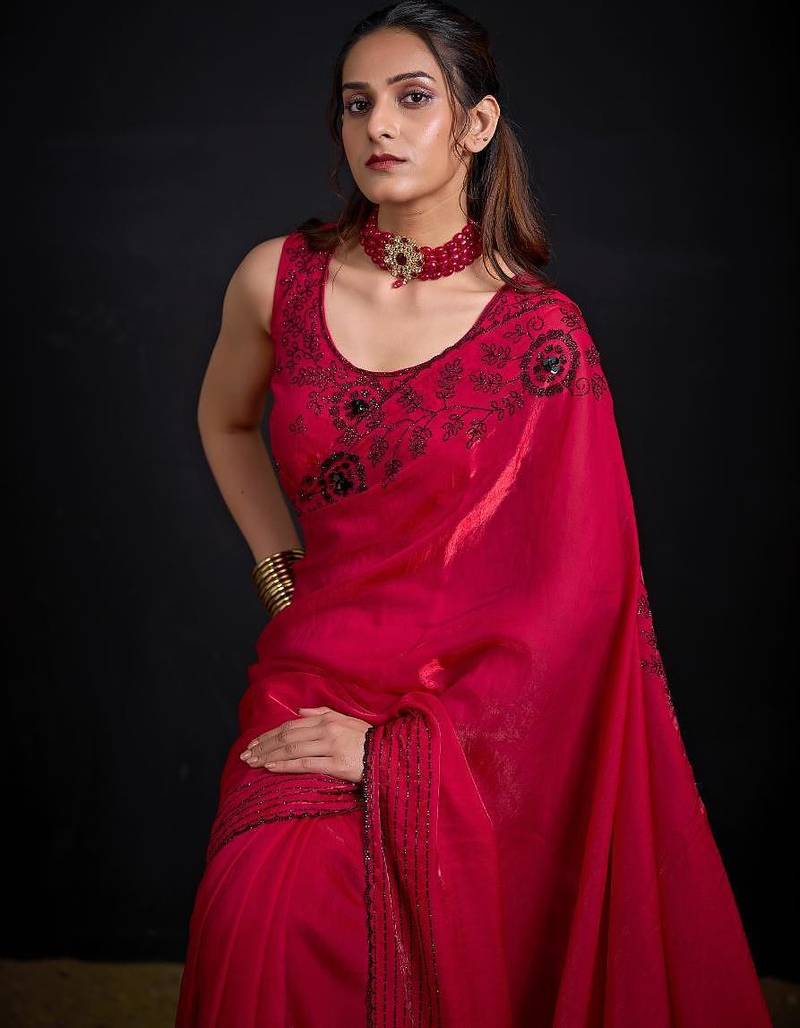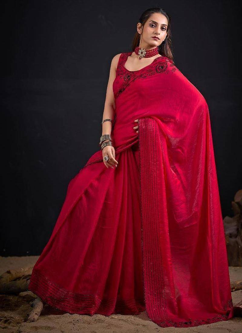 Rani color fendy satin silk two tone zircon sequence handwork saree