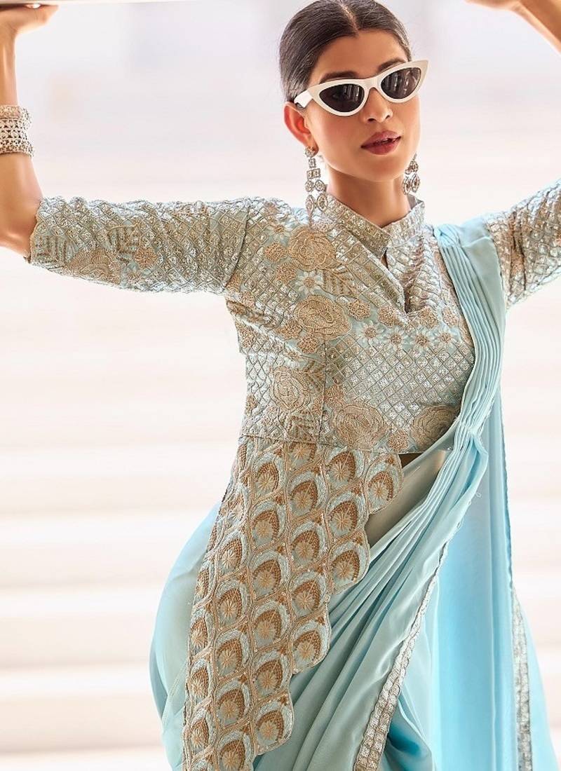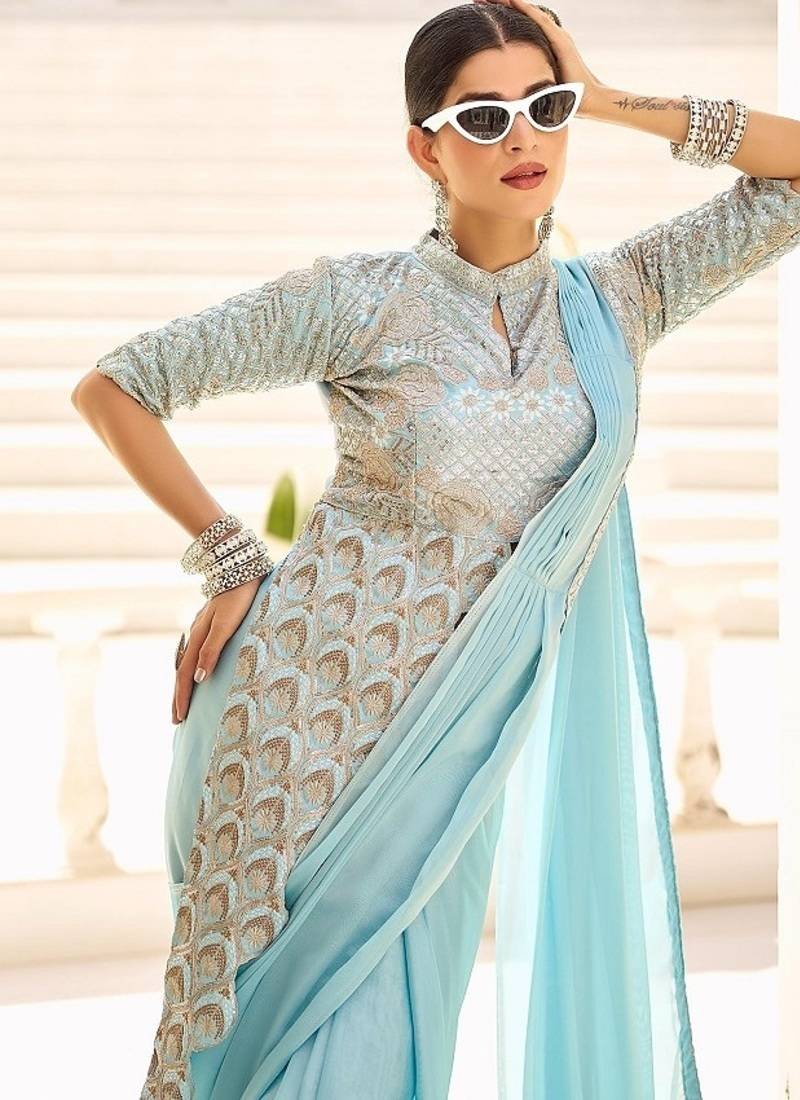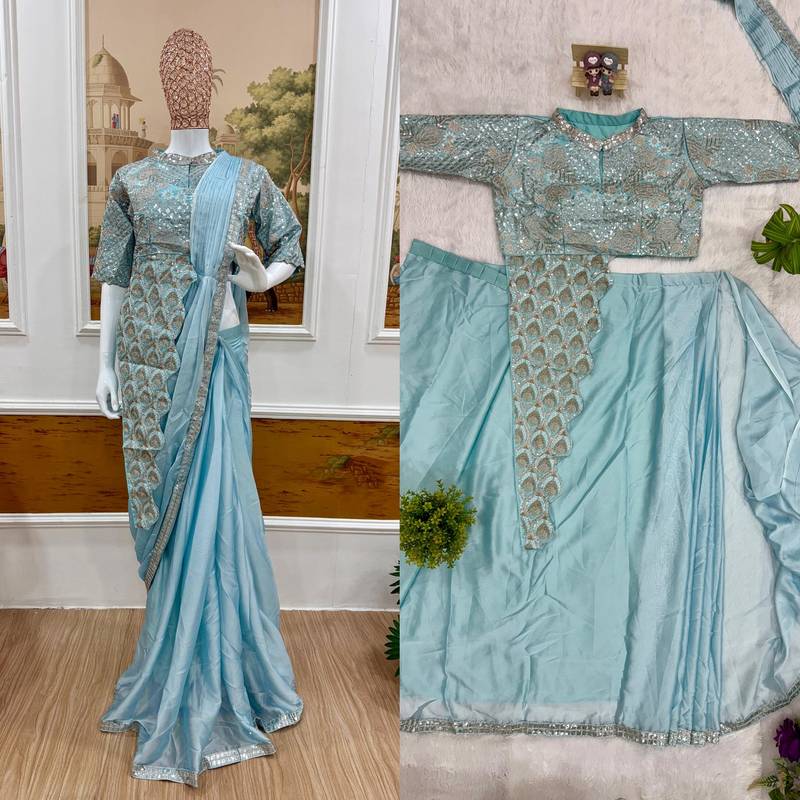 | Product Name | Ready To Wear Pre Drape Skyblue Color Rangoli Silk Saree With Stitch Blouse | |