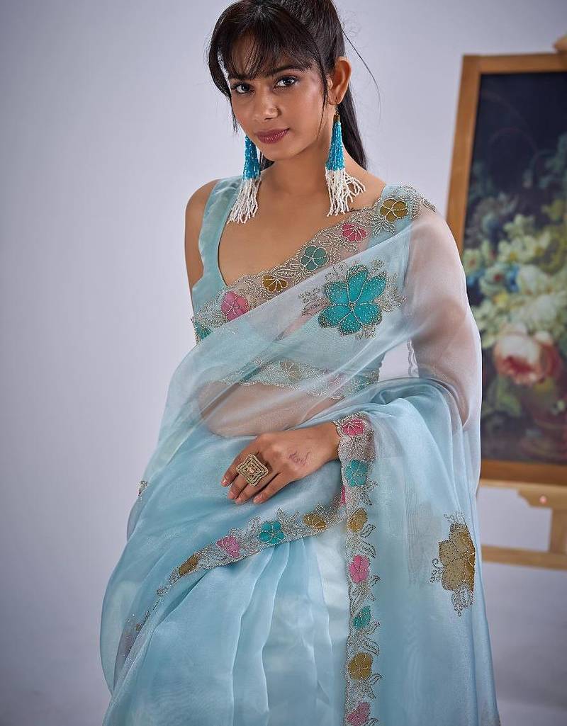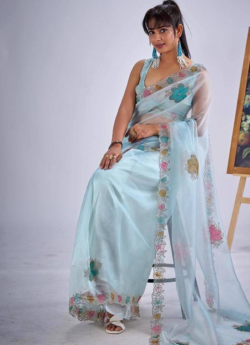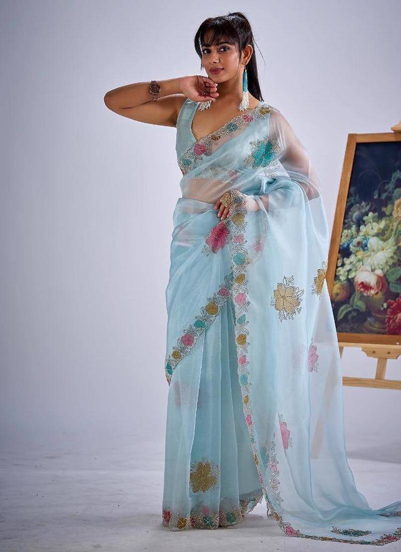| Product Name | Sky Color Soft Oregenza Tissue Handwork Zircon Border Saree | |