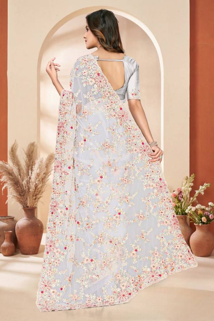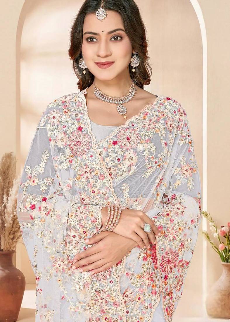 | Product Name | White Color Net Resham Embroidered & Zircon Work Saree | |