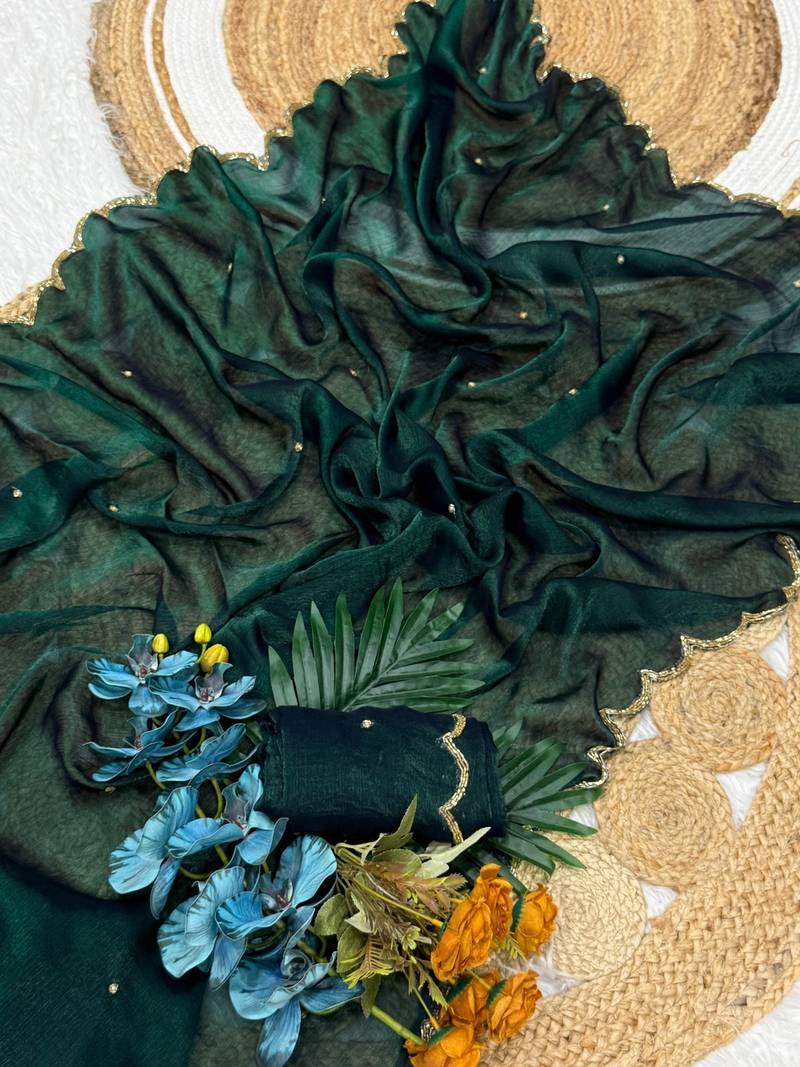 | Product Name | Green Color Khatli Beads & Moti Handwork Chiffon Silk Saree | |