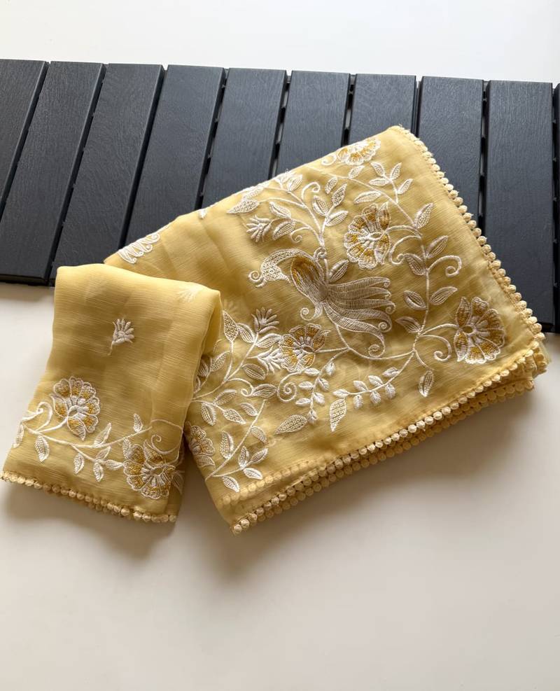 | Product Name | Yellow Color Bird N Floral Embroidery Work Chiffon Saree | |