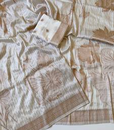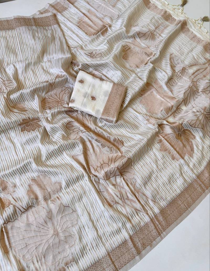 Beige color silver golden jari jaqurad weaving work georgette saree