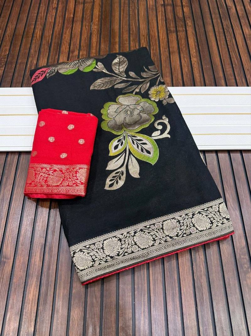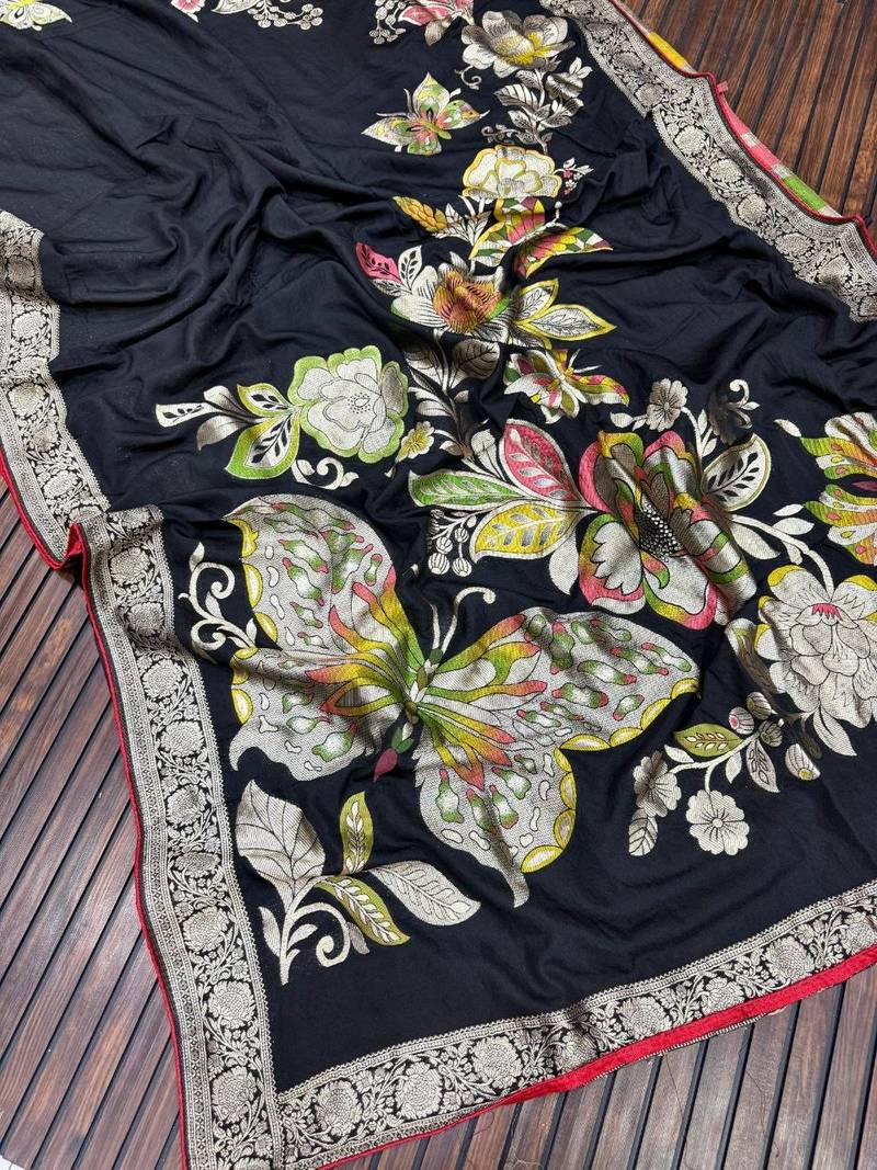 | Product Name | Black Color Meenakari Big Butterfly Figure Flower Work Viscos Khaddi Sarere | |
