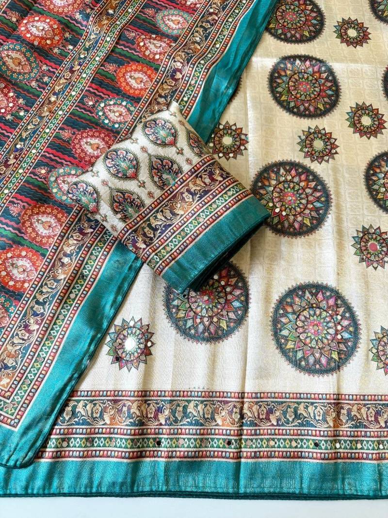| Product Description | Pure Softy Dola Silk Full Jari Jaqurad Weaving All Over Fabric Soft And Smooth Fall Feel Work : Original Uhd Position Print Type Digital Printing With Original Mirror Work ( Kanch)Heavy Dyuti Sticky Gum With Dori Piping Fitting |