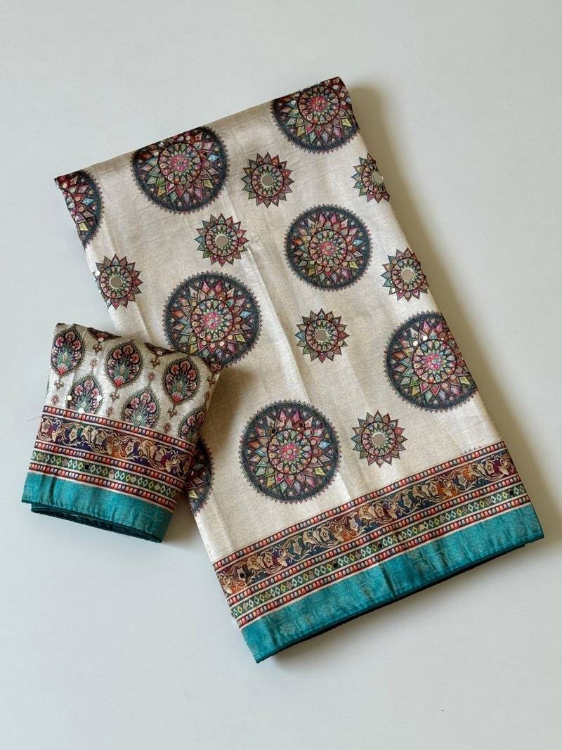 | Product Name | Blue Color Digital Printing With Original Mirror Work Dola Silk Saree | |