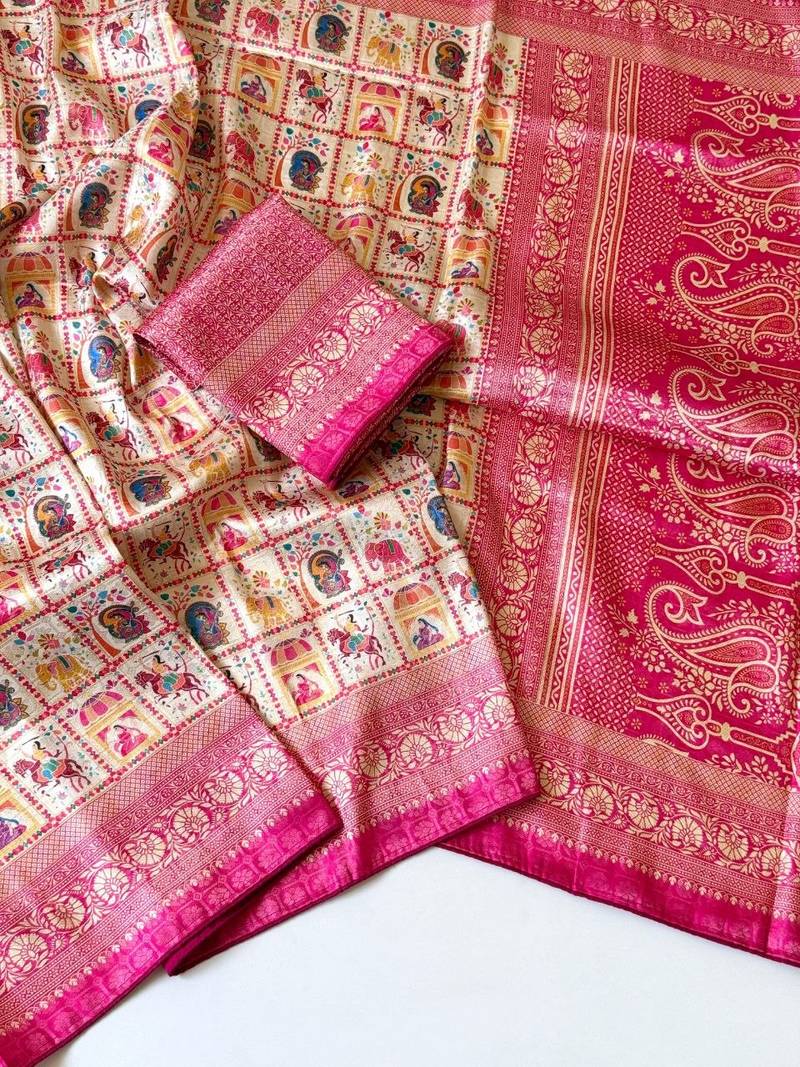 | Product Description | Pure Jari Weaving Softy Silk Jaqurad Weaving All Over Work : Position Print Tyap Digital Print Pasmina Weaving Test Uhd Digital Printing With Dori Piping Fitting |
