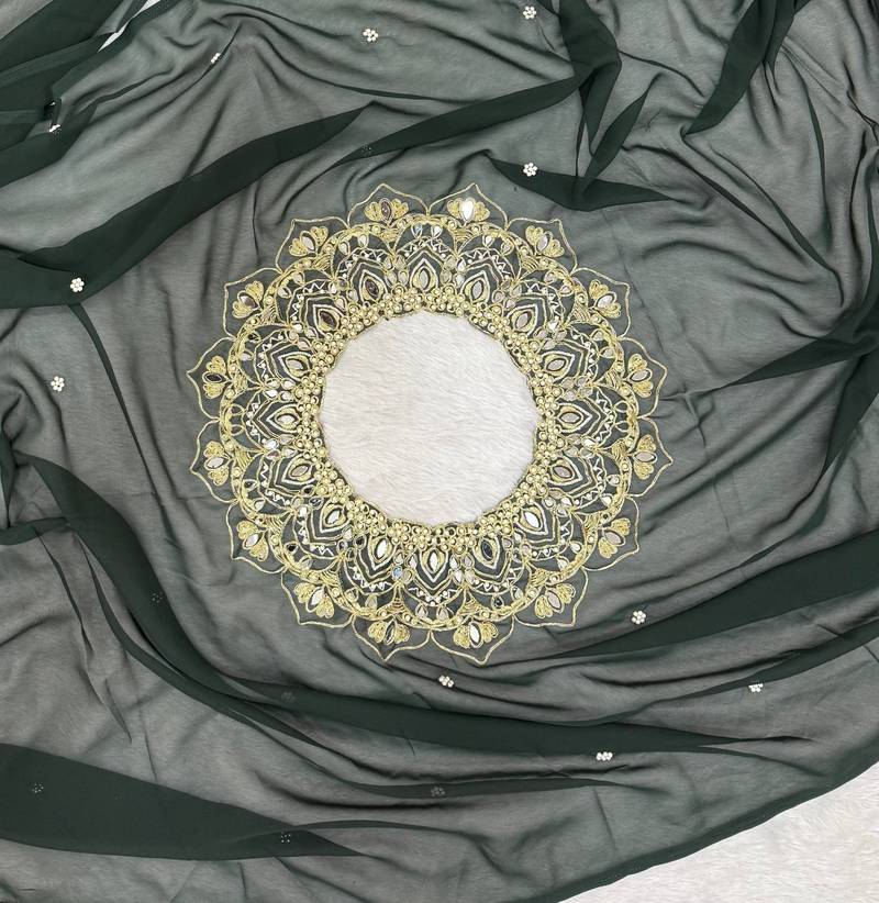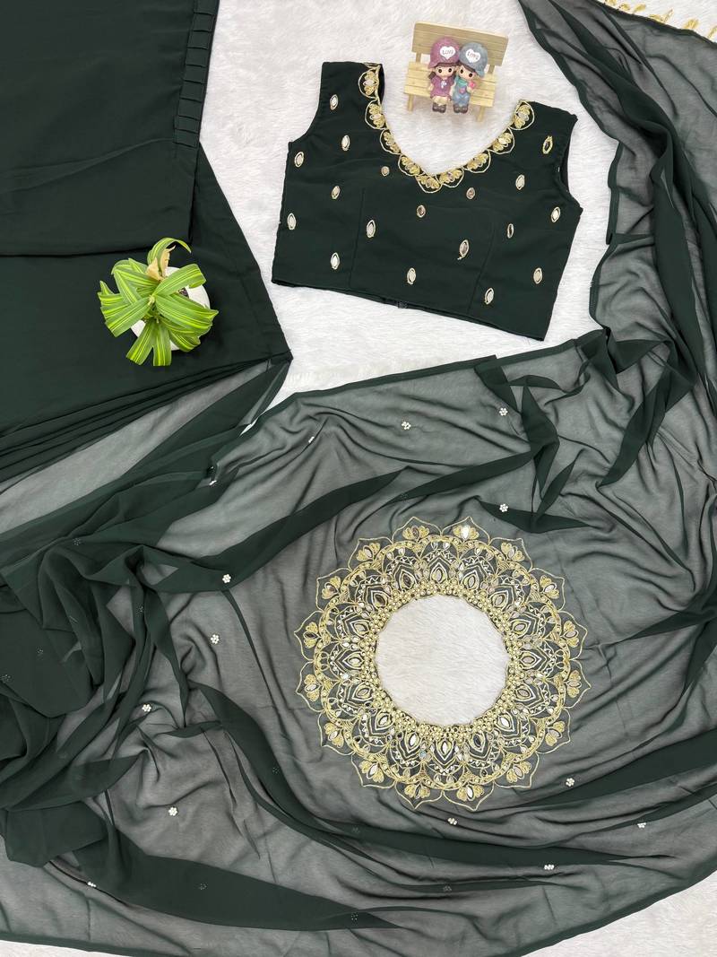 Dark green color embroidery,real mirror & pearls work faux georgette ready to wear saree