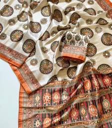 Orange color digital printing with original mirror work dola silk saree