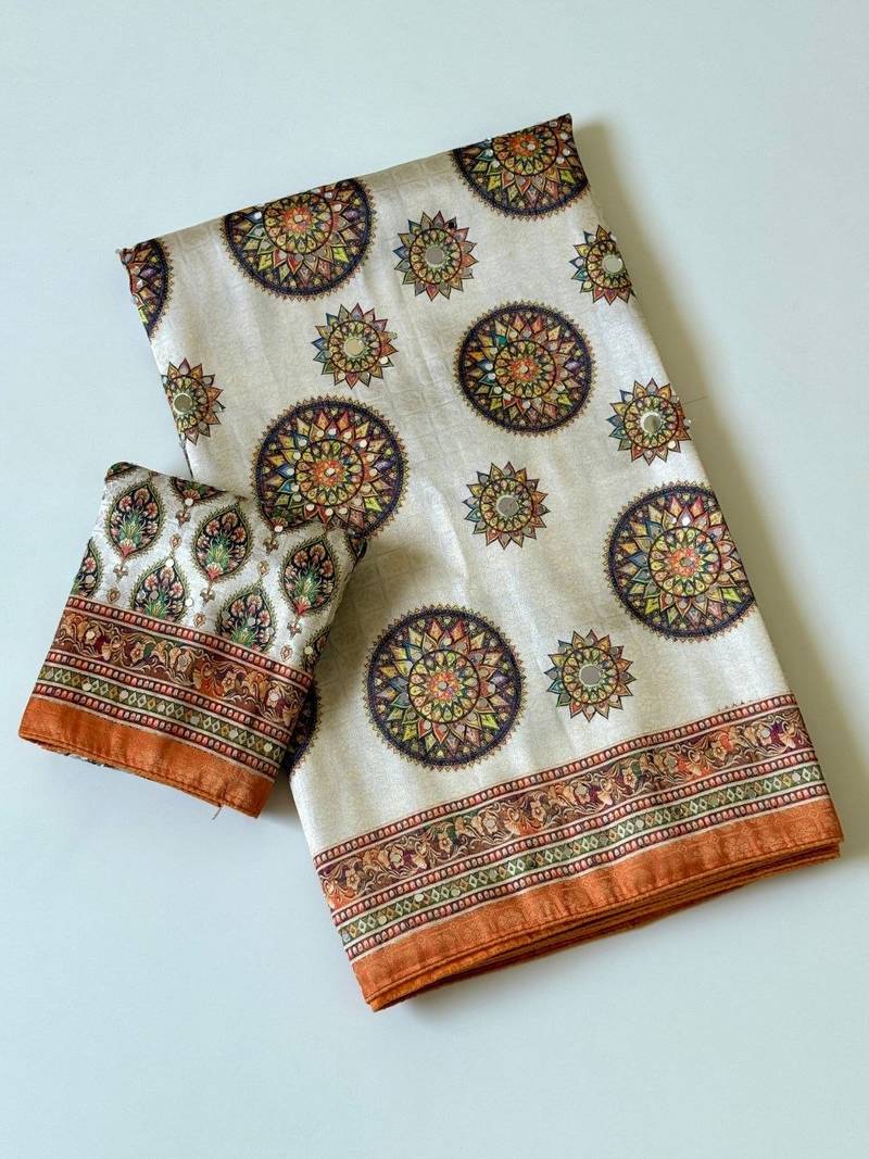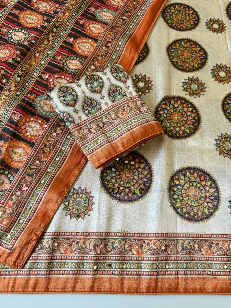 | Product Name | Orange Color Digital Printing With Original Mirror Work Dola Silk Saree | |