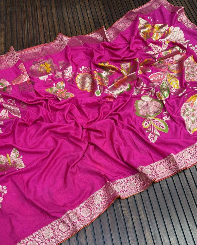 Pink color meenakari big butterfly figure flower work viscos khaddi sarere
