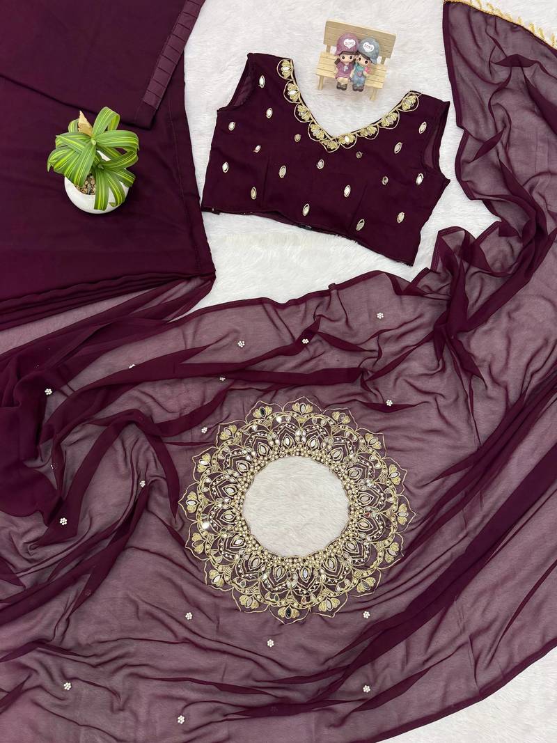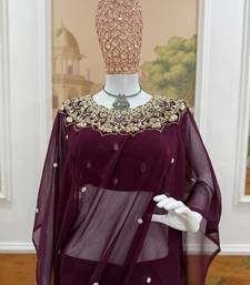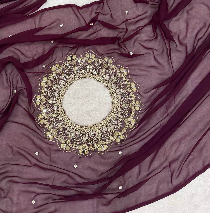 Plum color embroidery,real mirror & pearls work faux georgette ready to wear saree