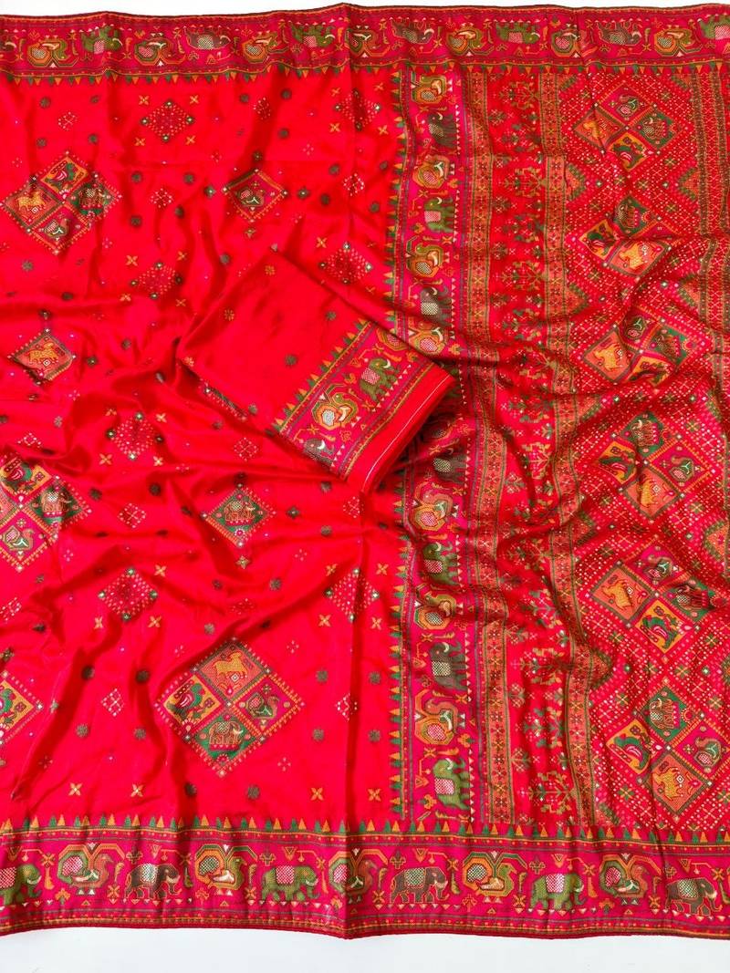 | Product Description | Pure Heavy Rajwada Pasmina Silk Original Minakari Jaqurad Weaving Over Pic Patola With Figure Weaving Patola Border With Rich Pallu Running Blouse Piece Soft And Smooth* Work : Purely Hand Daying Single Colour Saree With Contrast Colour Blouse Piece With Dori Piping Fitting |