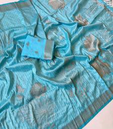 Sky blue color silver golden jari jaqurad weaving work georgette saree