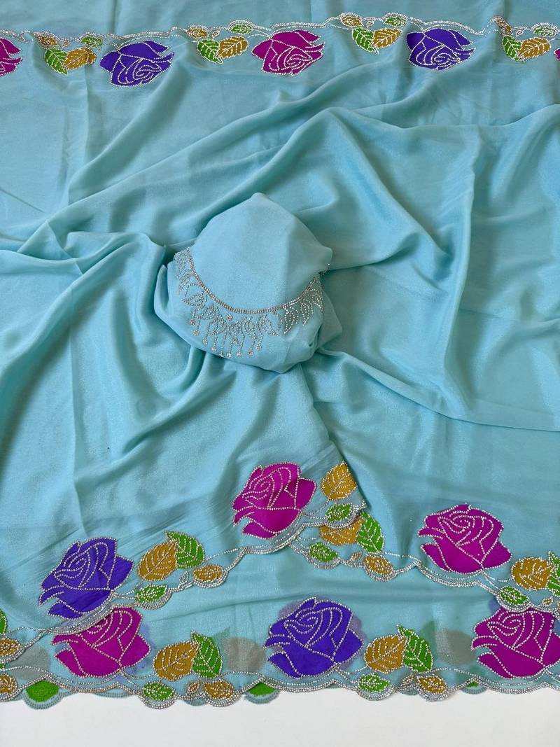 Sky blue color zarkhan diamond flowers outing work georgette saree