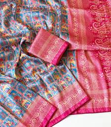 Teal color digital print pasmina weaving silk saree