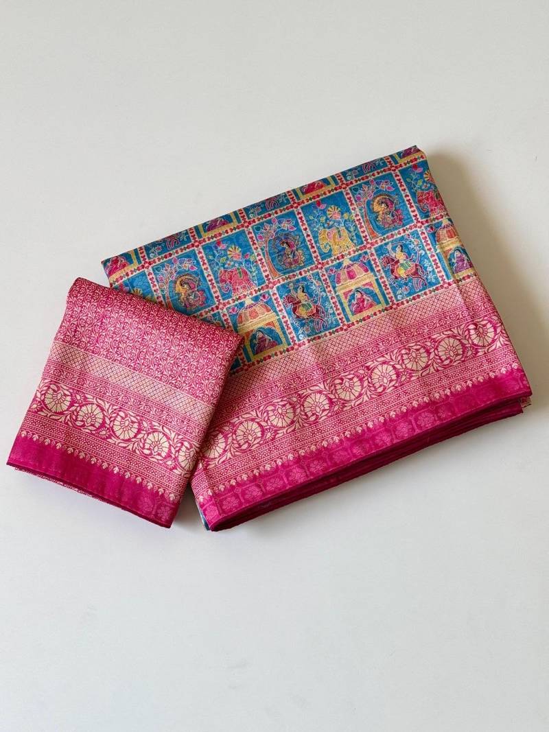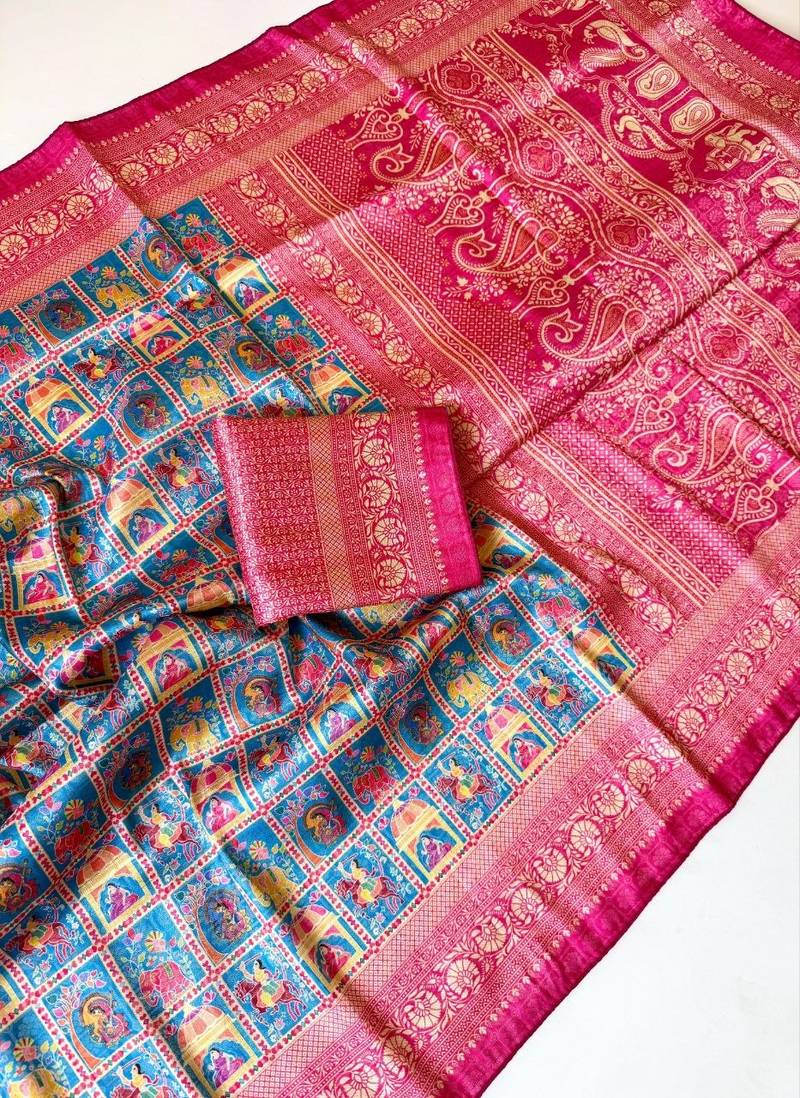 | Product Name | Teal Color Digital Print Pasmina Weaving Silk Saree | |