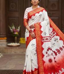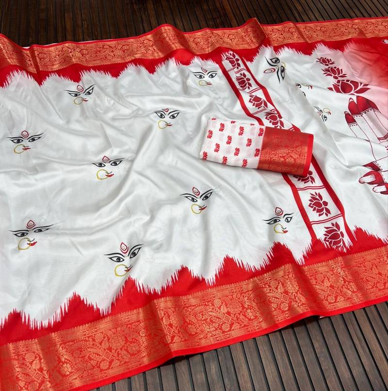 | Product Name | White Color Digital Printing Durga Pooja Woek Silk Saree | |