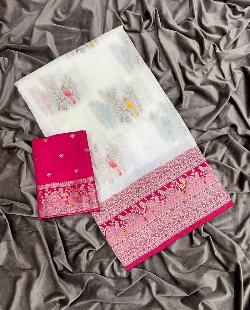White color jari jaqurad weaving with hand chap daying georgette saree