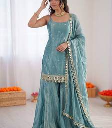Turquoise fendy silk thread with mirror work plazzo suit stitched