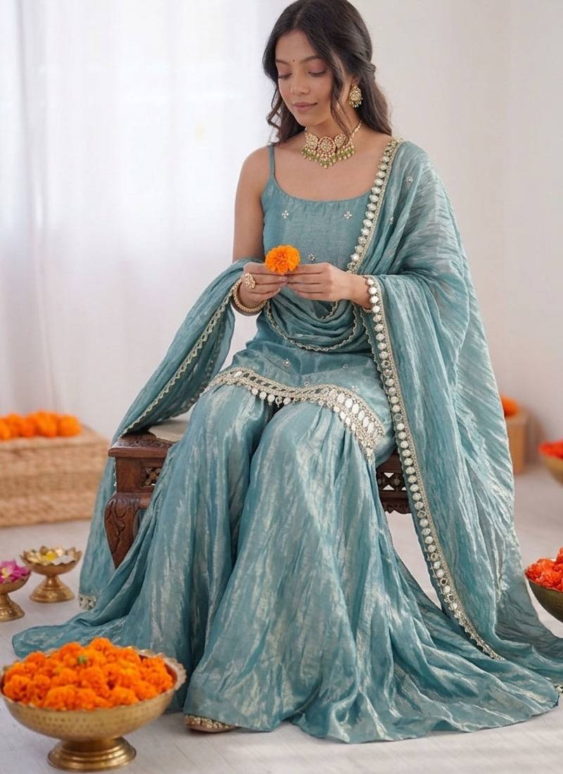 | Product Name | Turquoise Fendy Silk Thread With Mirror Work Plazzo Suit | |
