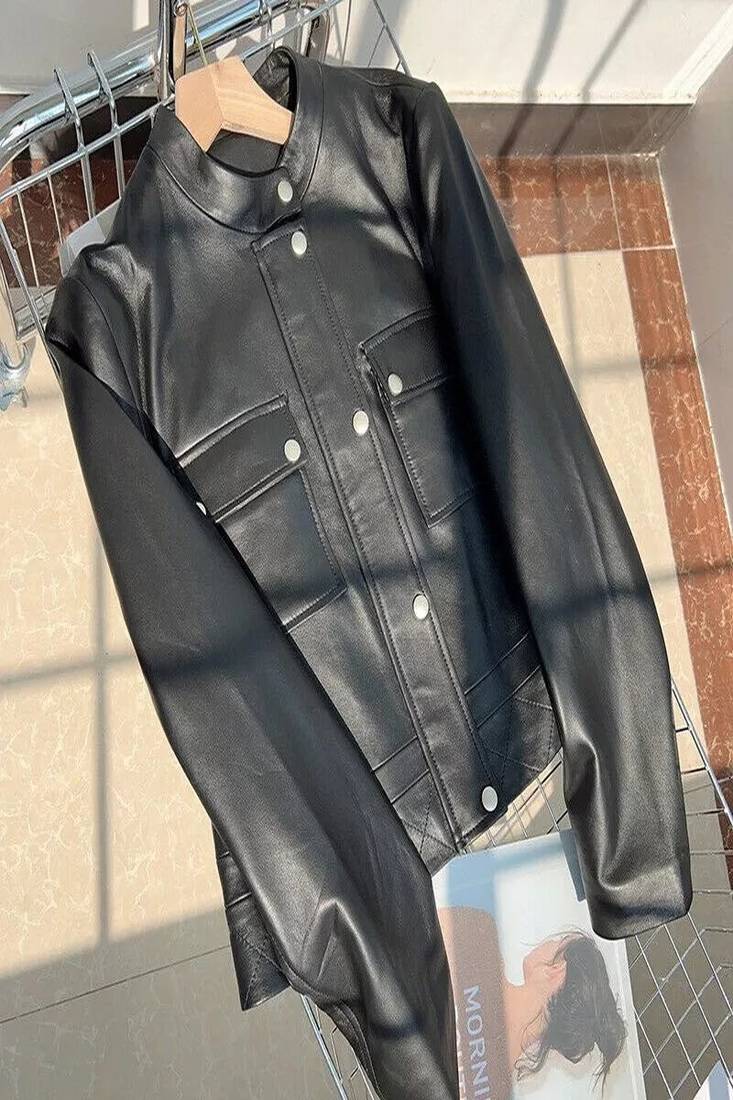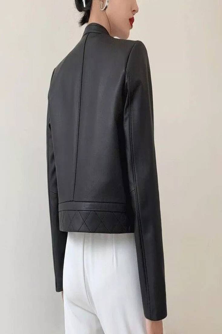 Women’s jacket stand collar sheepskin leather vintage slim fit moto biker zip