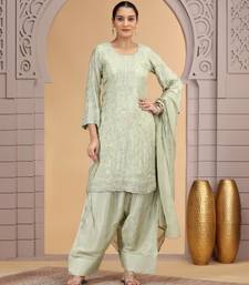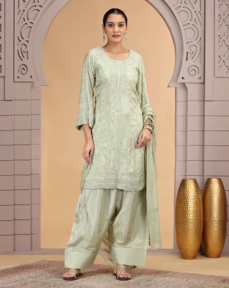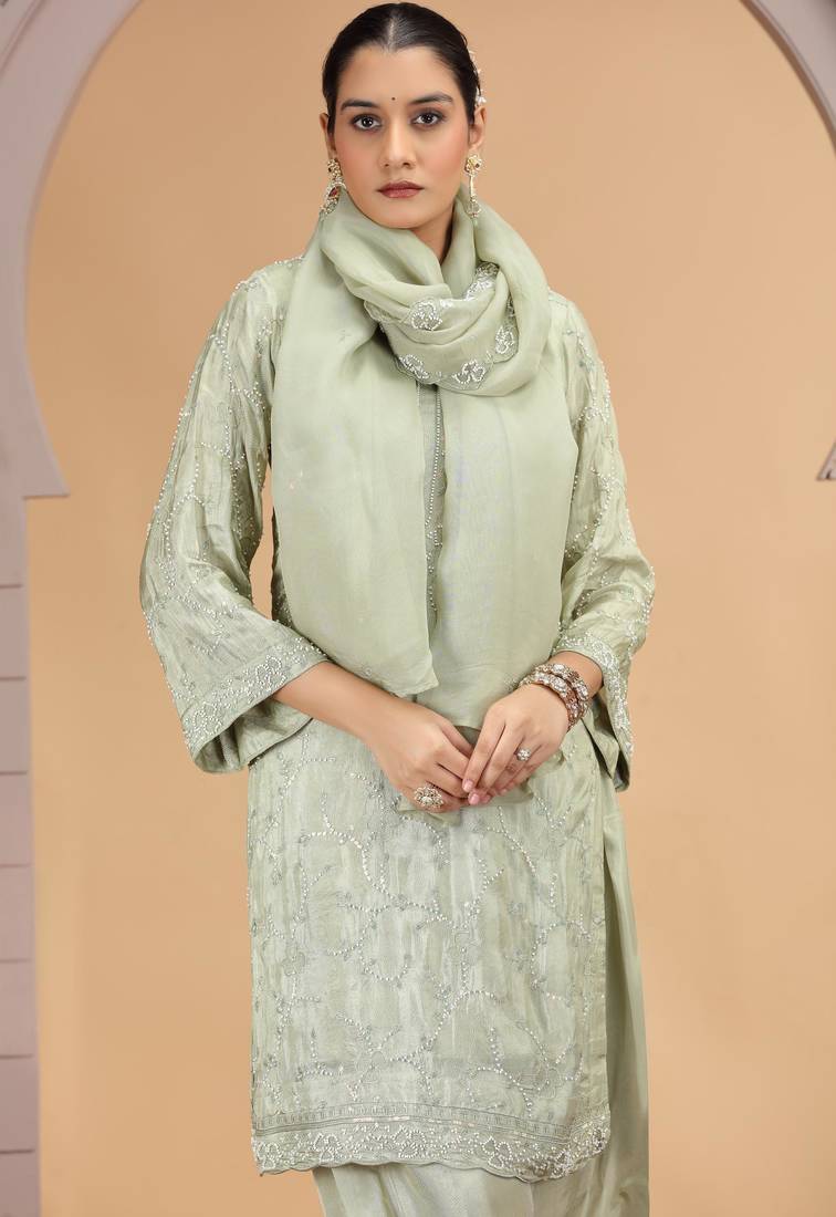 Green satin silk kurta set with farsi pant style & dupatta stitched