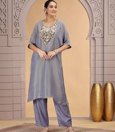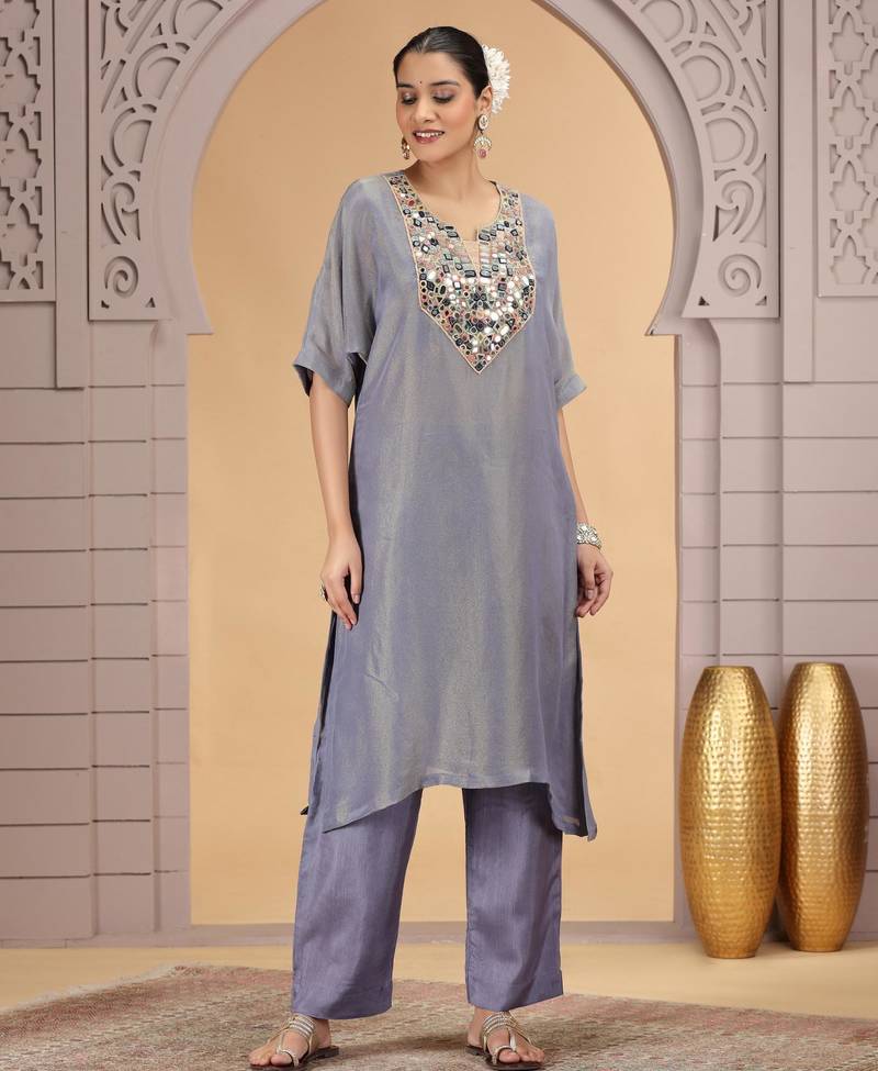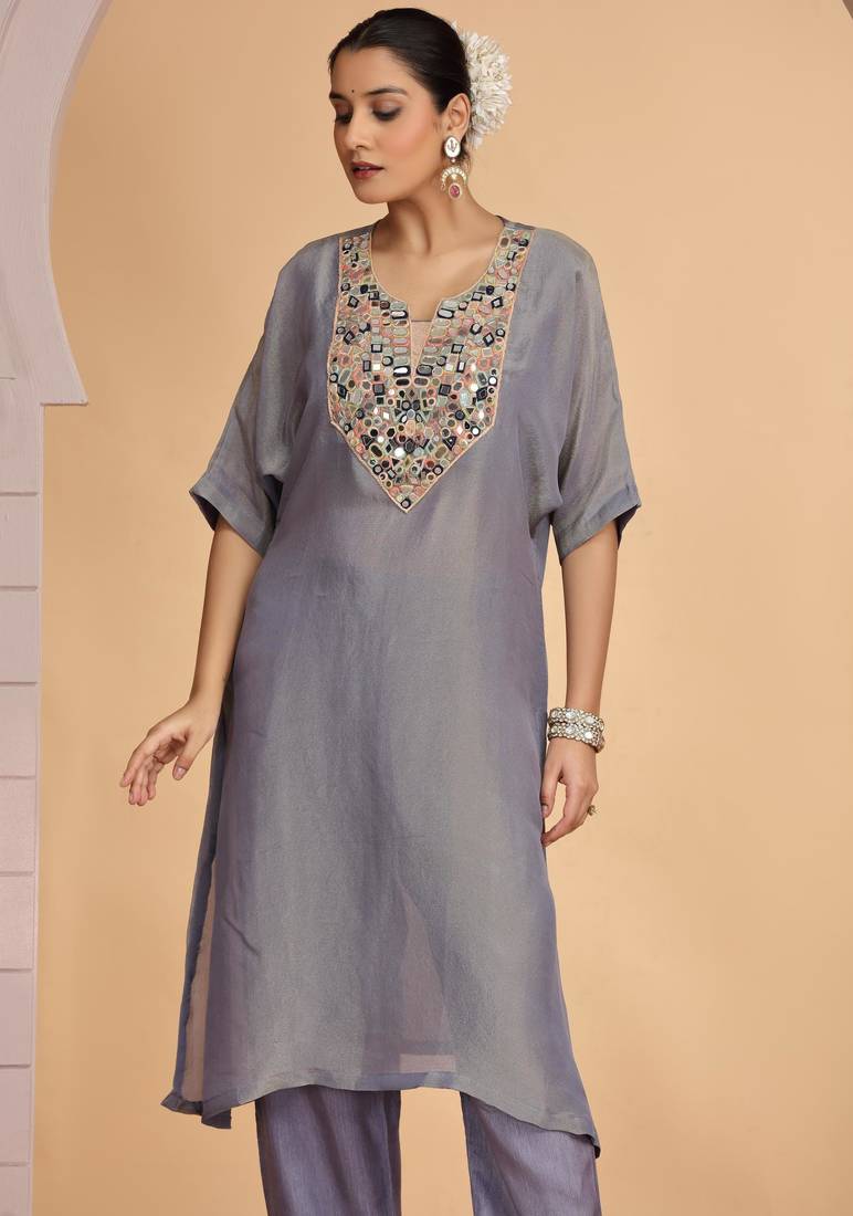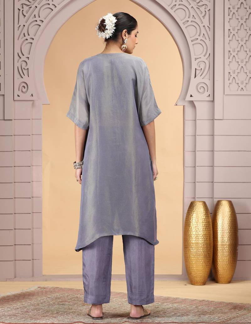 Grey orgenza shimmer a - line kurta set with loose pant style stitched
