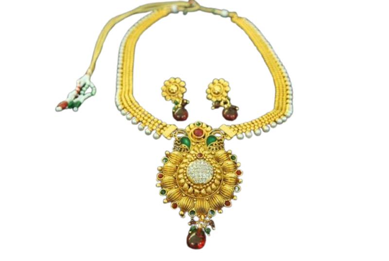 | Product Description | This Beautiful Gold Plated Peacock Necklace Set Comes With American Diamond, Ruby & Studded With Pearls. |