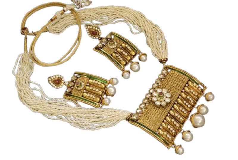 | Product Description | This Rajwadi Maharana Pratap Copper Base Necklace Set Comes With Beaded Pearl Neckline, Copper Pendant Set Studded With Kundan, Ruby Stone & American Diamond. This Jewellery Is Same As Seen On Tv Serial Maharana Pratap. Note: Please See The Actual Image Of The Jewellery Before The Purchase... It Is A Look A Like Image Of The Image Given In First Image.. |