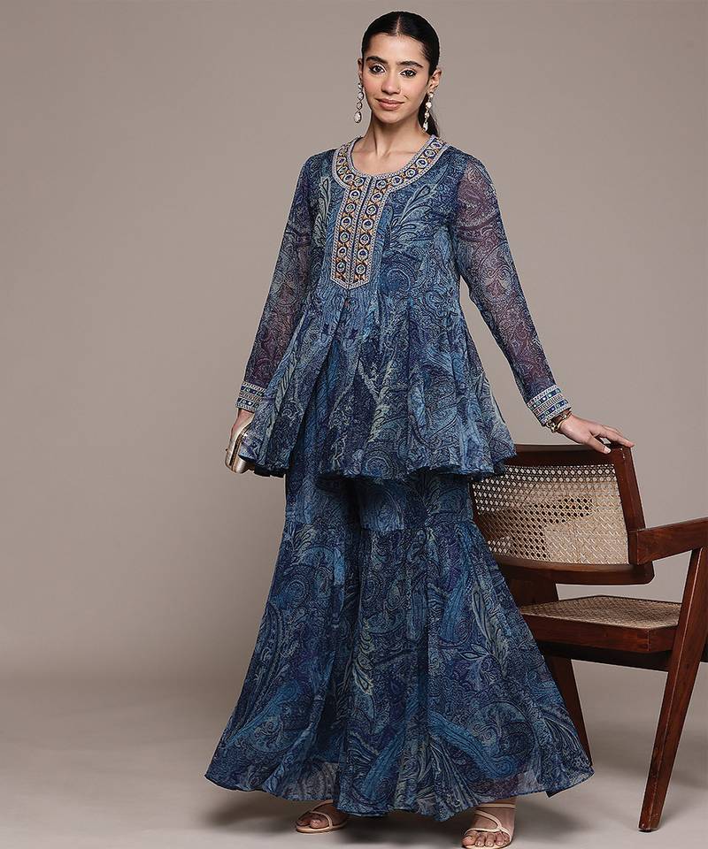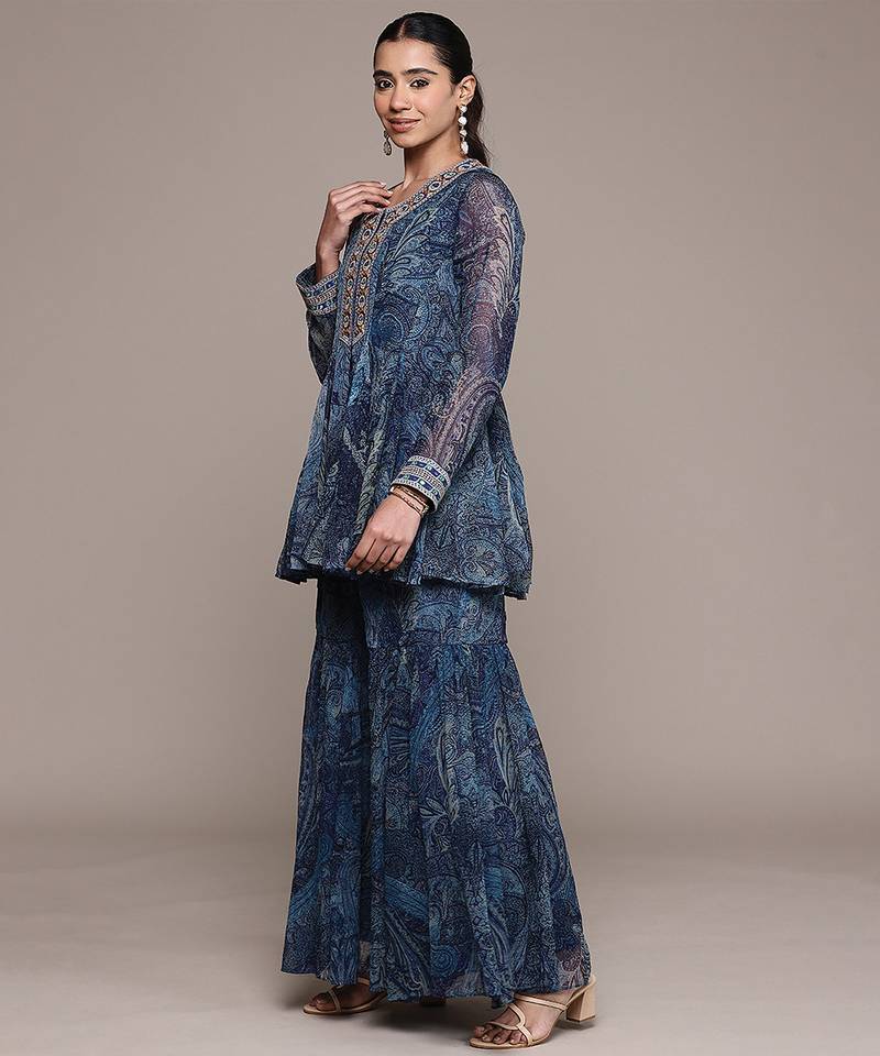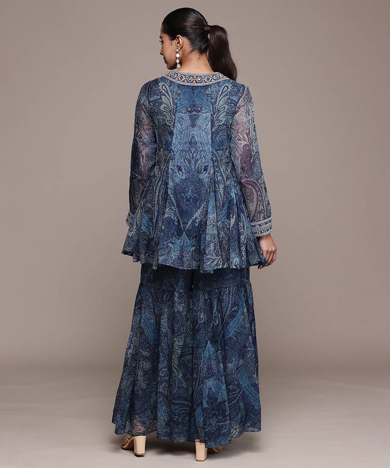 Blue printed chiffon sharara set