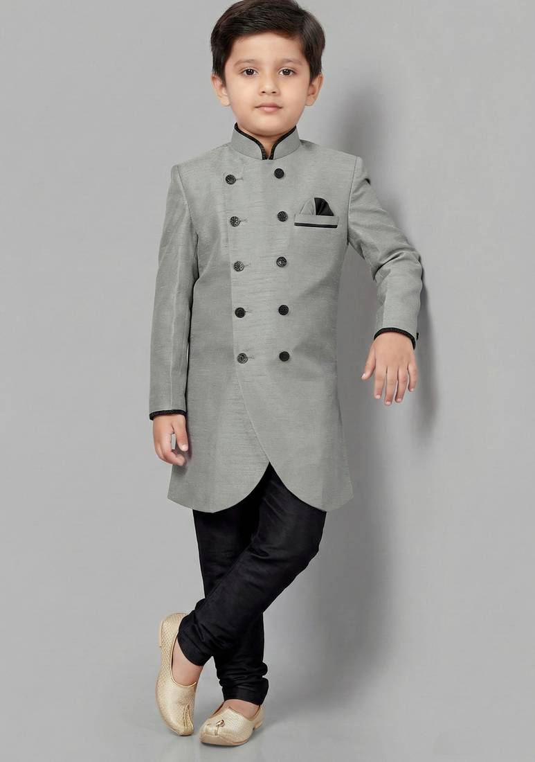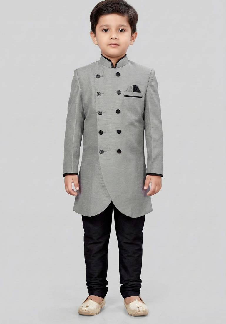 Grey festive wear designer art dupion silk boys-indo-western-dress