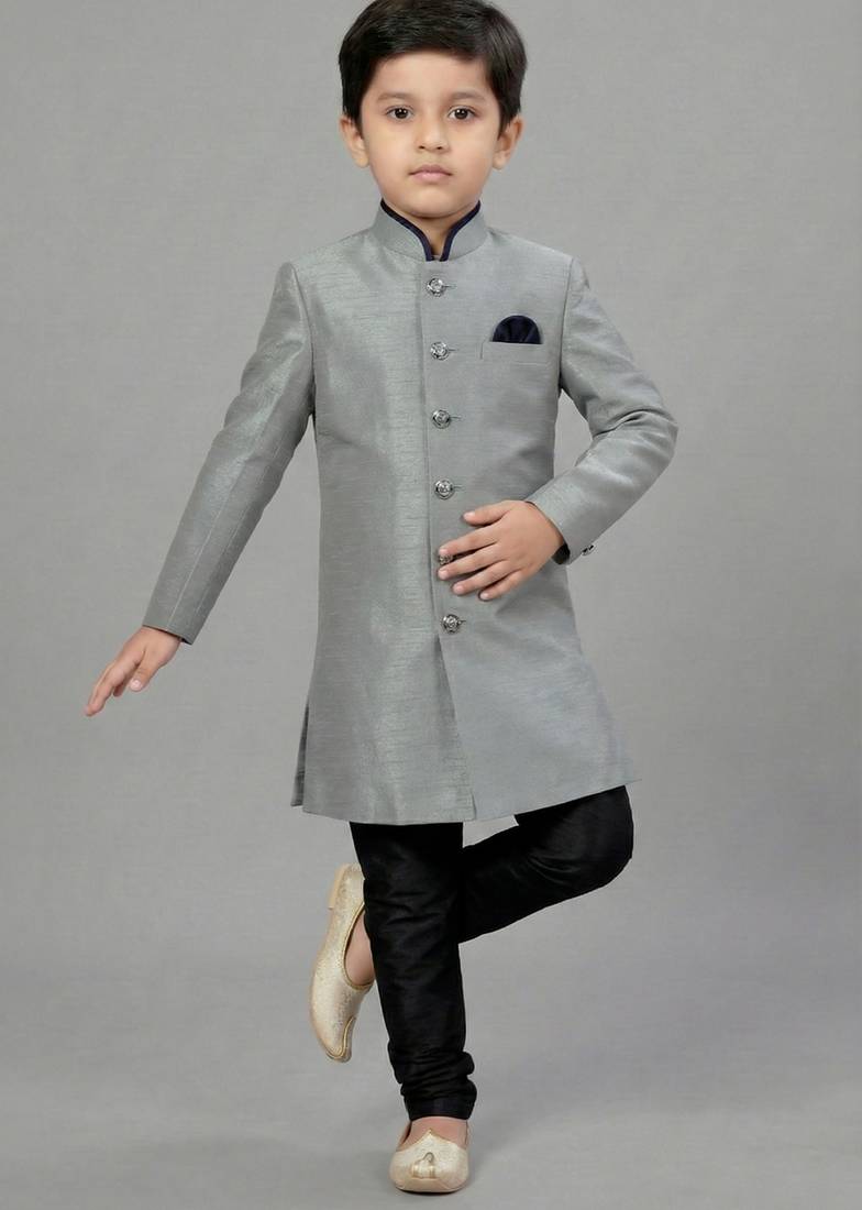 | Product Name | Grey Festive Wear Designer Art Dupion Silk Boys Indo Western Dress | |