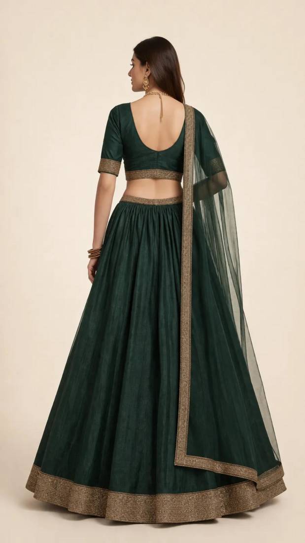 | Product Description | Exude Regal Elegance In This Dark Green A Line Lehenga, Featuring A Sophisticated Self Weave Slub Texture Enhanced With Subtle Sequin Highlights. The Ensemble Is Defined By Its Rich Zari Embellished Borders And Paired With A Matching V Neck Blouse And A Lace Bordered Net Dupatta, Making It A Perfect Choice For Weddings And Royal Festive Occasions. |