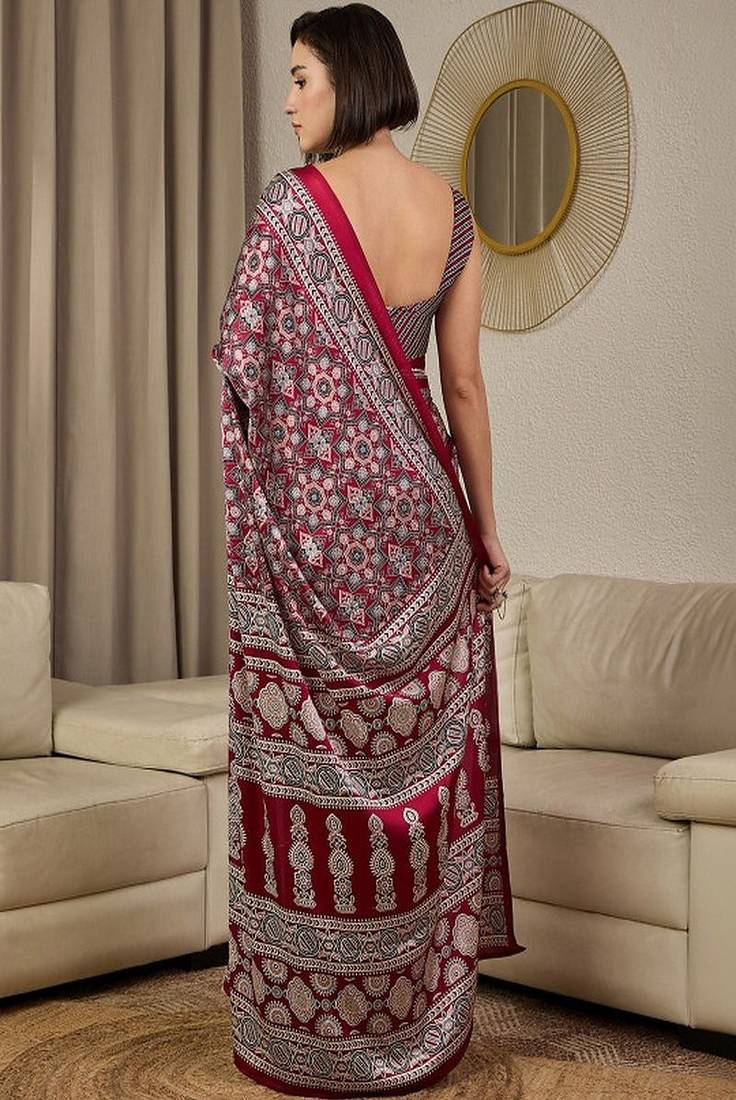 Ajrak printed pure crepe block print ready to wear saree with unstitched blouse