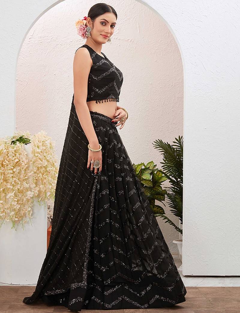 Embroidered sequinned foil print ready to wear lehenga & blouse with dupatta free size upto 42