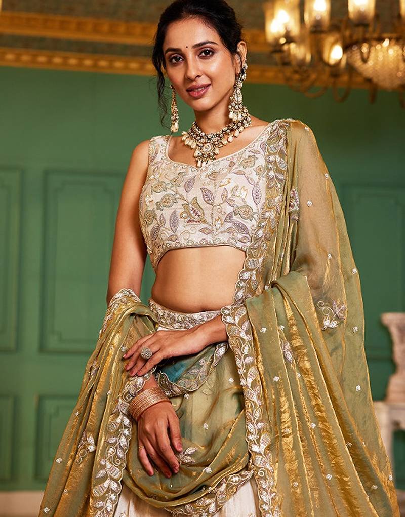 Embroidered sequinned semi-stitched lehenga & unstitched blouse with dupatta free size upto 42