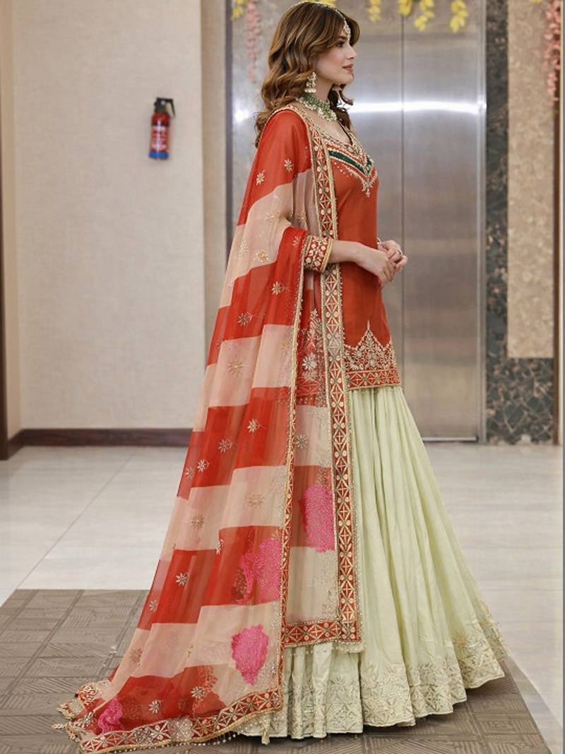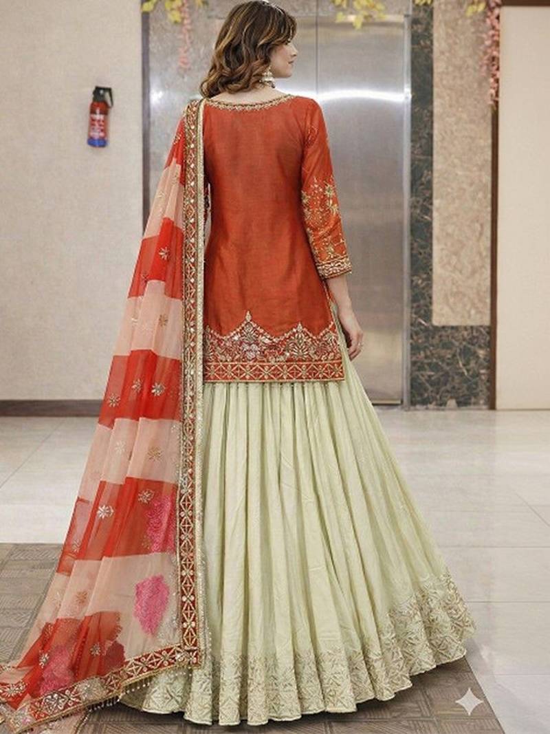 | Product Name | Embroidered Thread Work Ready To Wear Lehenga & Blouse With Dupatta Free Size Upto 42 | |