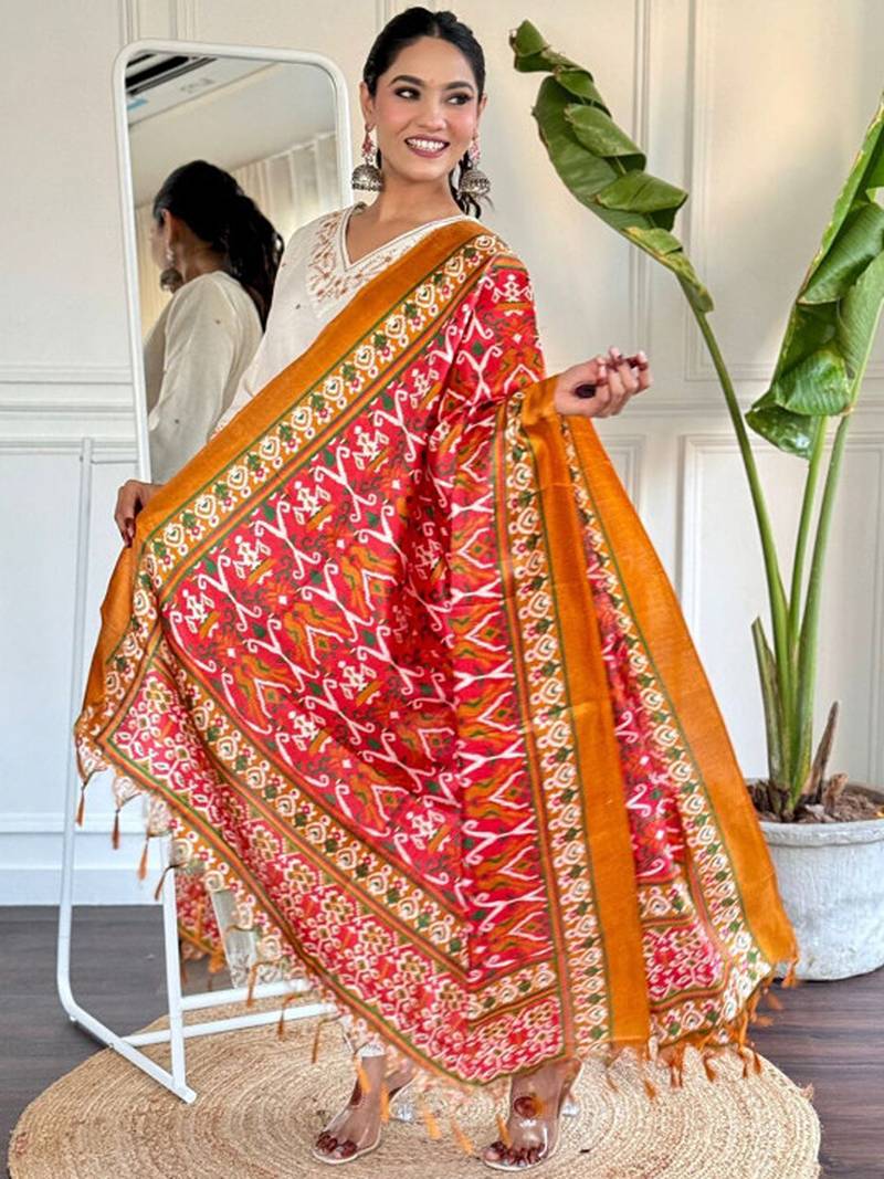 Ethnic motifs embroidered pure cotton kurta with trousers & dupatta