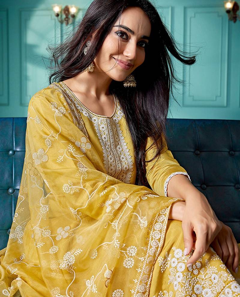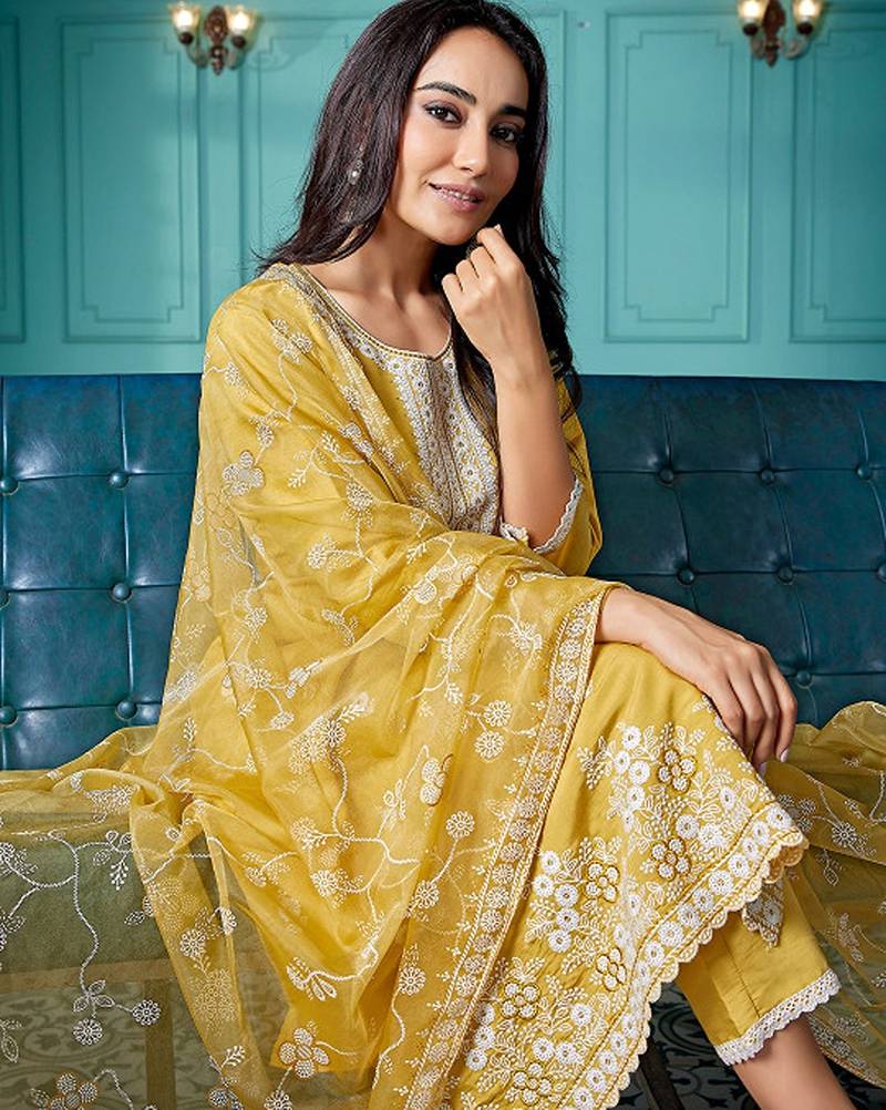 | Product Description | Yellow & White Embroidered Kurta With Trousers With Dupatta Kurta Design: |