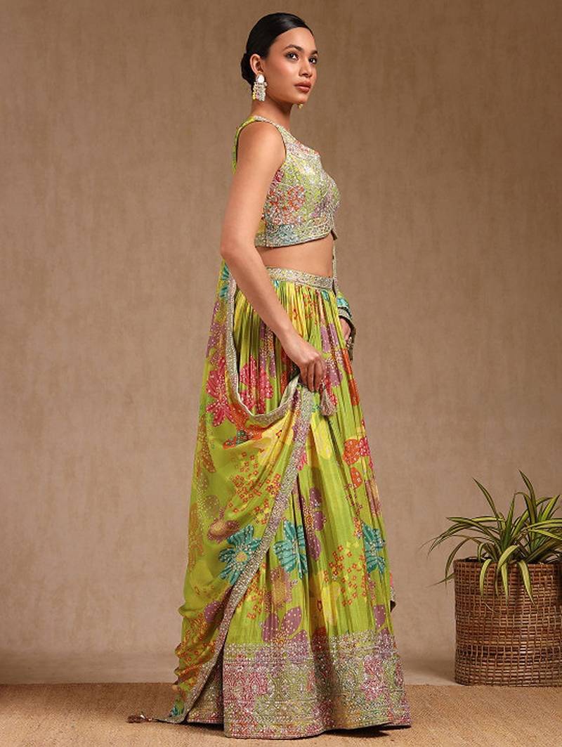 Floral embroidered sequinned ready to wear chinon lehenga & blouse with dupatta free size upto 42
