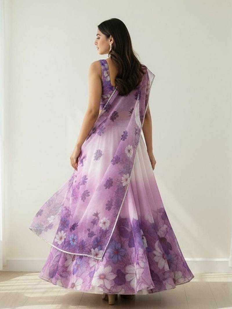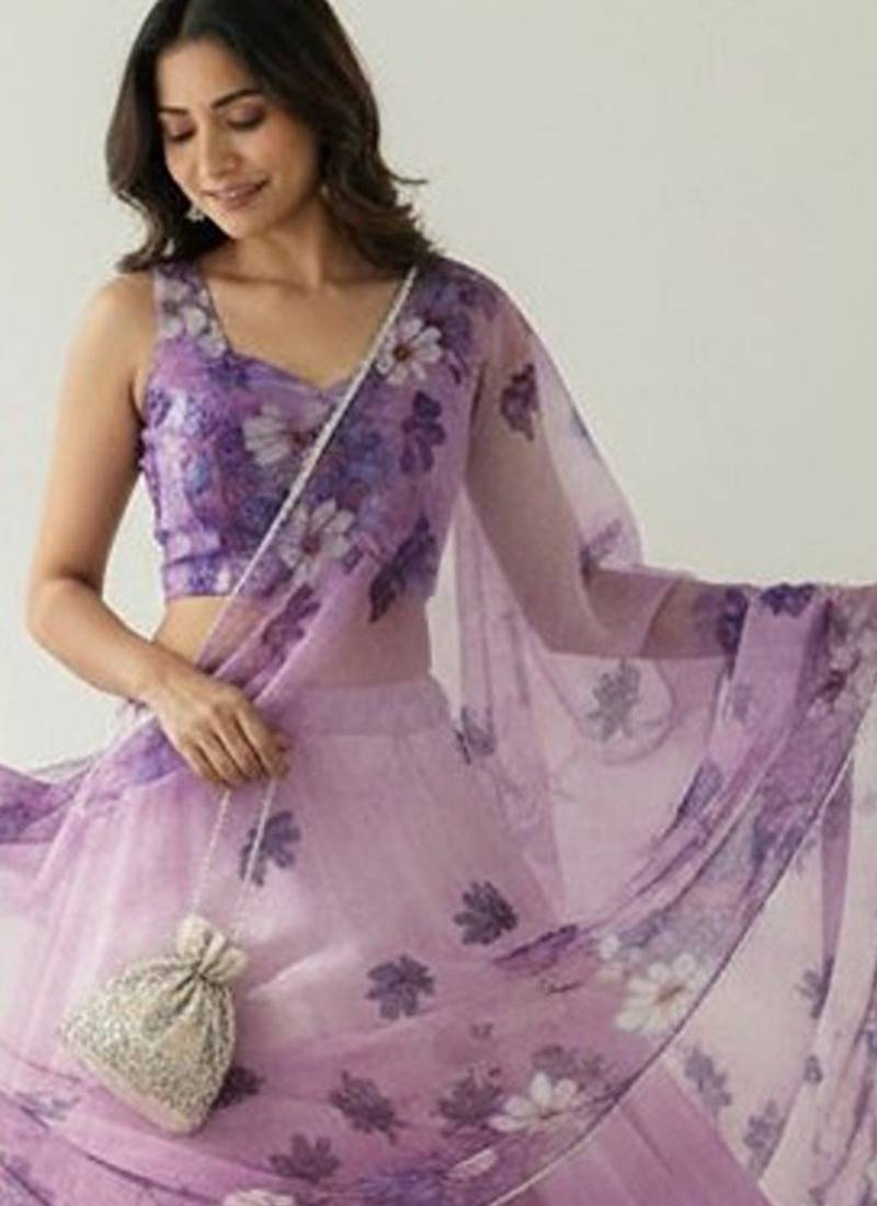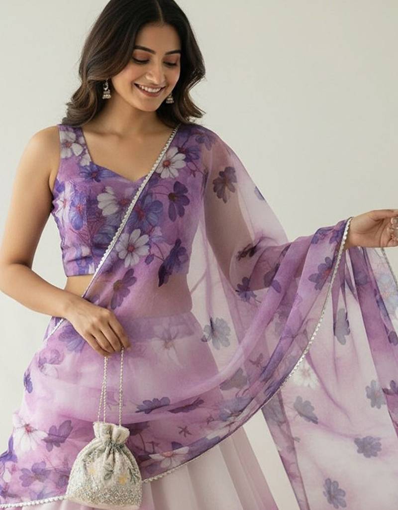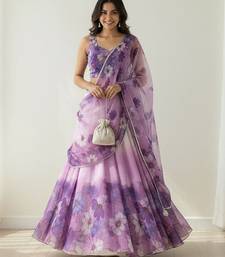 Floral printed organza semi-stitched lehenga & blouse with dupatta free size upto 42