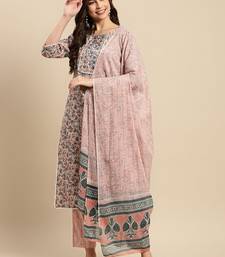 Peach & blue floral-printed pure-cotton straight kurta with trouser & dupatta